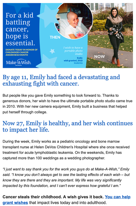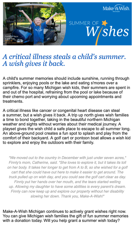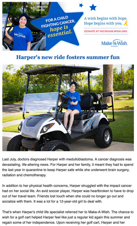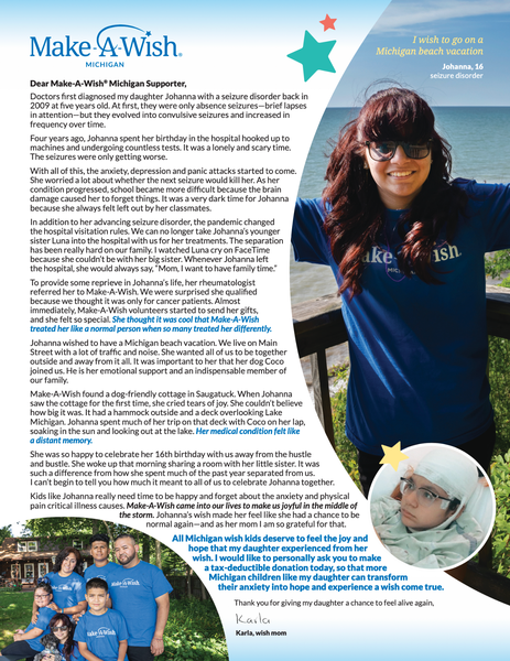 I crafted this wish mom letter for our 2020 year-end appeal mailing that went out to 27k+ of our Michigan supporters.
